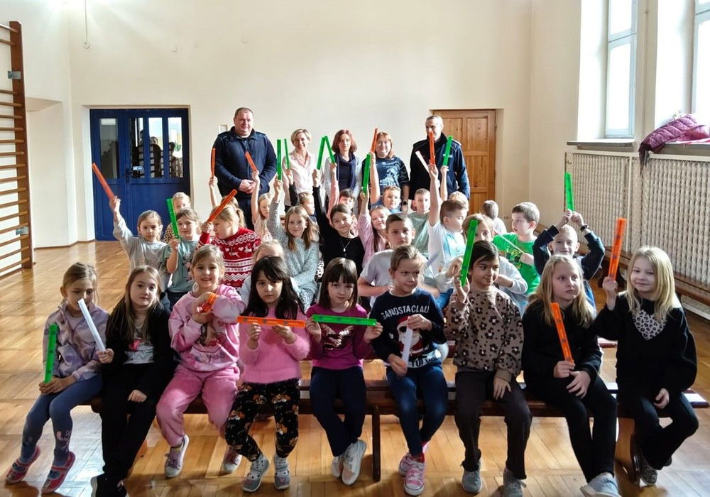Dzielnicowi i funkcjonariusze ruchu drogowego odwiedzili Szkołę Podstawową w Suścu w ramach kampanii Kręci mnie bezpieczeństwo z zimie, przypominając zasady bezpiecznych zabaw, zachowania przy drogach i korzyści z noszenia odblasków.